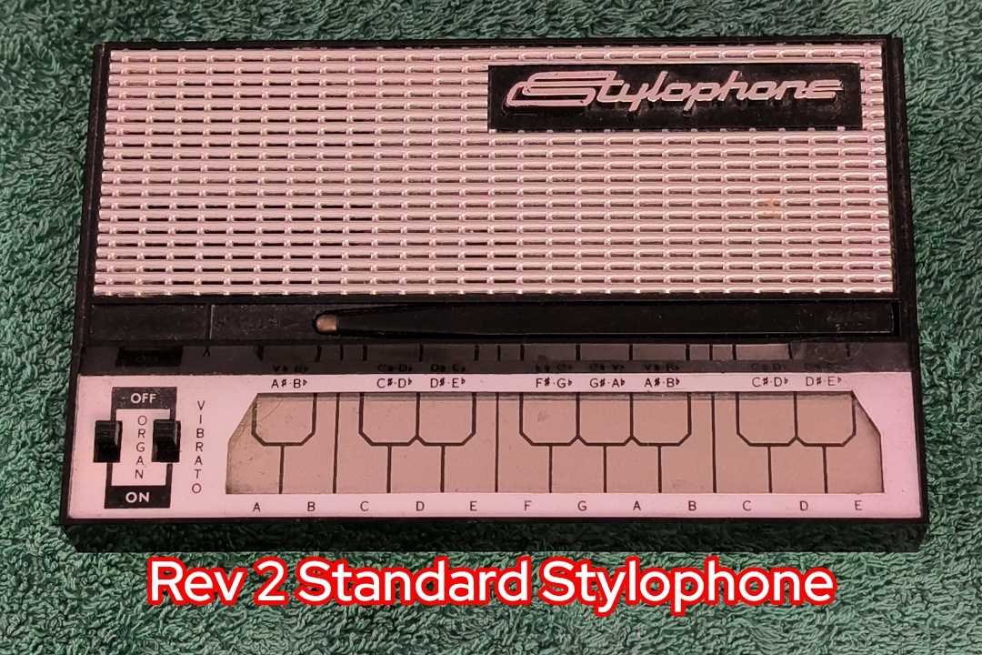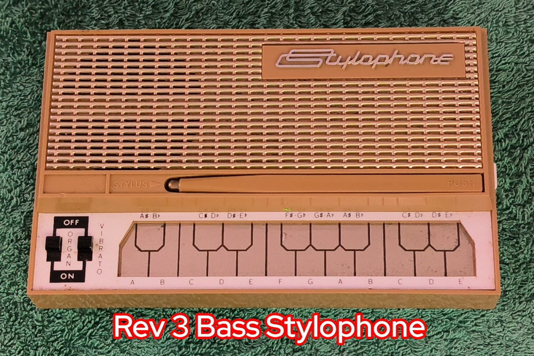 There were also bass and treble Stylophones. The 'standard' Stylophone is black and white in colour with a silver grille. Treble stylophones started out as all white with a black grille, then became all white with a silver grille for rev 3.